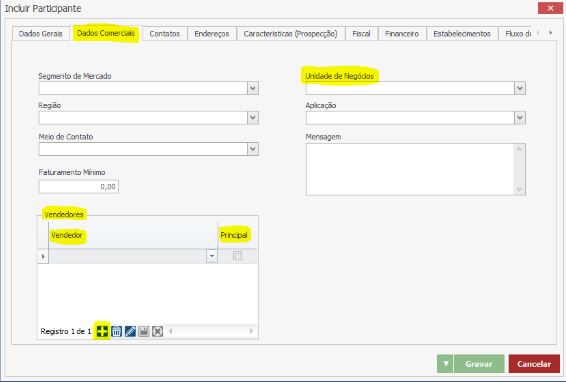 Clique no botão NOVO para inserir a linha e selecione o Vendedor. Caso deseje adicionar mais vendedores, basta repetir o procedimento. A flag “Principal” somente pode ser marcada em um dos Vendedores informados (caso existam mais de um). Esta flag representa o Vendedor com maior relevância junto ao Cliente.