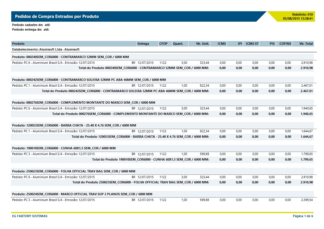Este relatório apresenta separadamente por Produto todos os Pedidos de Compra Entrados (nesse relatório o Pedido de Compra é exibido mesmo estando com Status Em Edição) por Produtos.