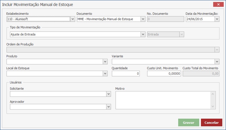 · Ajuste de Custo Entrada - Inclui no Local de Estoque selecionado o Custo Total do Movimento informado na Movimentação.