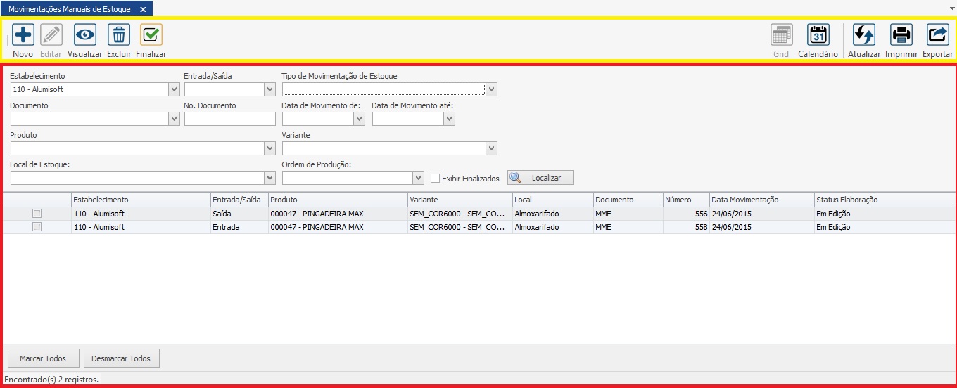Ao acessar a tela principal de Movimentação Manual de Estoque, será exibido o quadro abaixo. Este é dividido em duas partes: