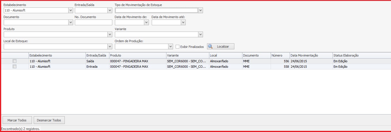 Filtro Local de Estoque - Exibe todos os Locais de Estoque cadastrados no sistema. Quando selecionado um Local de Estoque, exibirá na grid as Movimentações realizadas com o Local de Estoque selecionado.