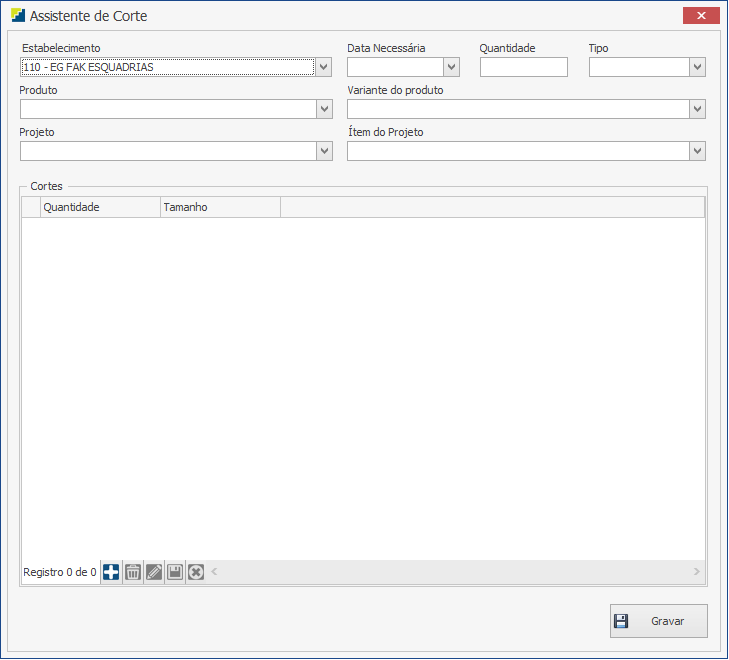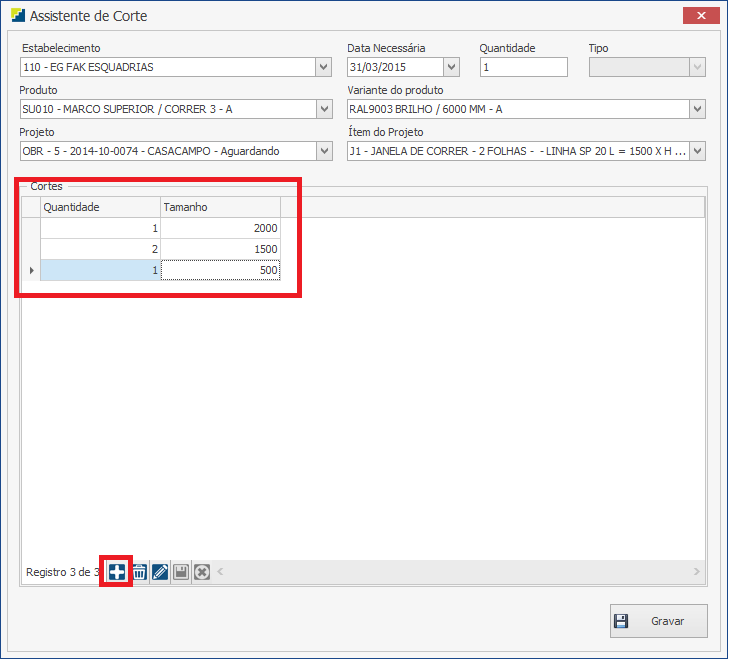 No campo Quantidade e Cortes destacados, deve preencher quantos cortes em determinadas medidas serão utilizados.