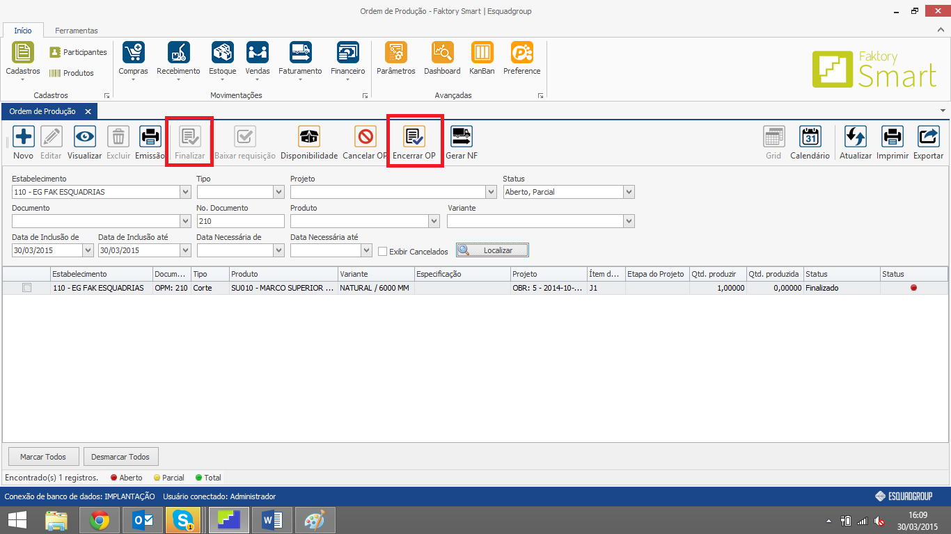 Acessando a opção de Ordem de Produção notaremos que uma ordem para corte dos materiais nas medidas necessárias foi criado: